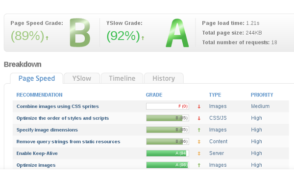 History tab shows the trend of important indicators of the page - Page Load Time, Page Size, Request Count and Speed scores - for a range of dates. We find it useful to check some of the large pages occasionally and known how they are performing over the period.